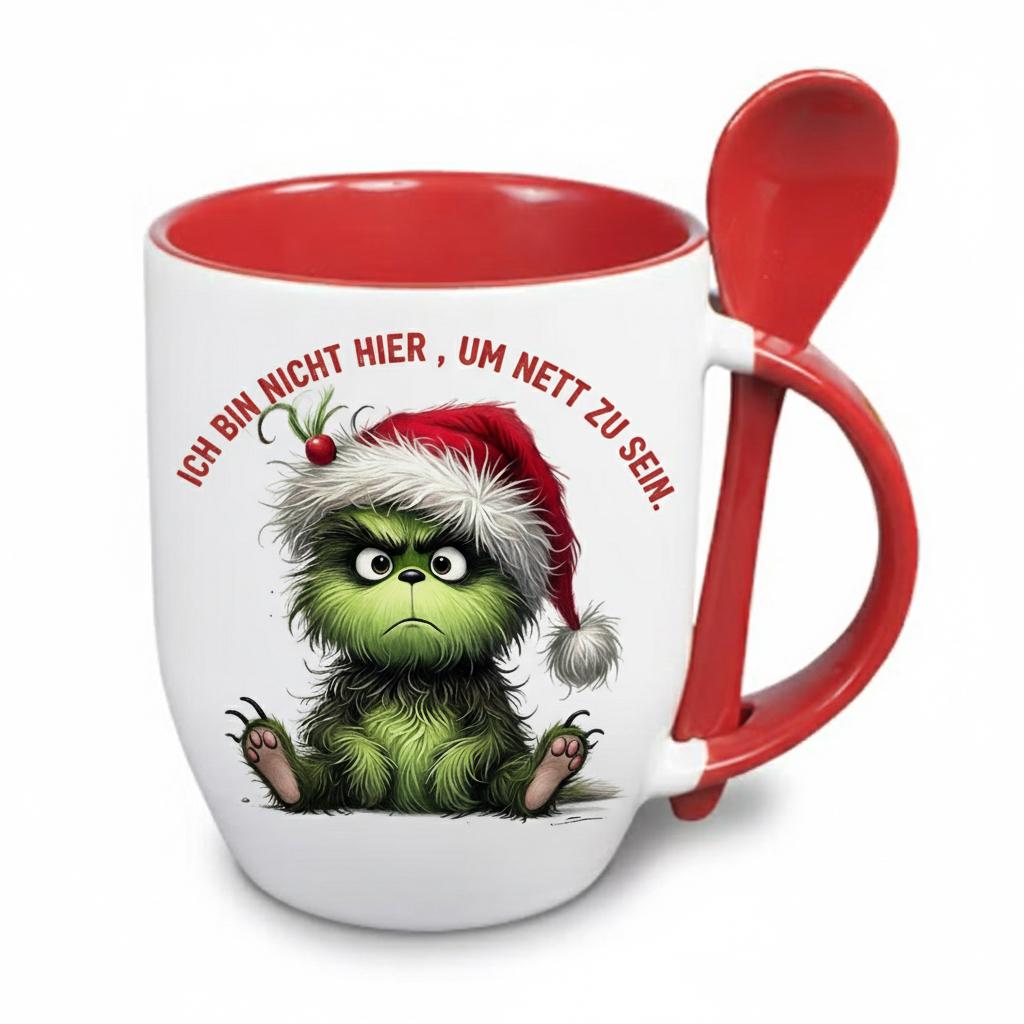 "Ich bin nicht hier, um nett zu sein." Grinch-Tasse – Der Weihnachtsmuffel-Klassiker mit Löffel!