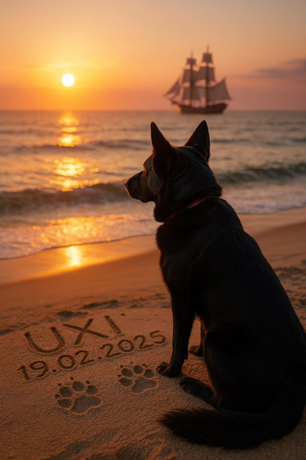 Motiv: Treuer Hund am Strand bei Sonnenuntergang mit Segelschiff und Fußspuren