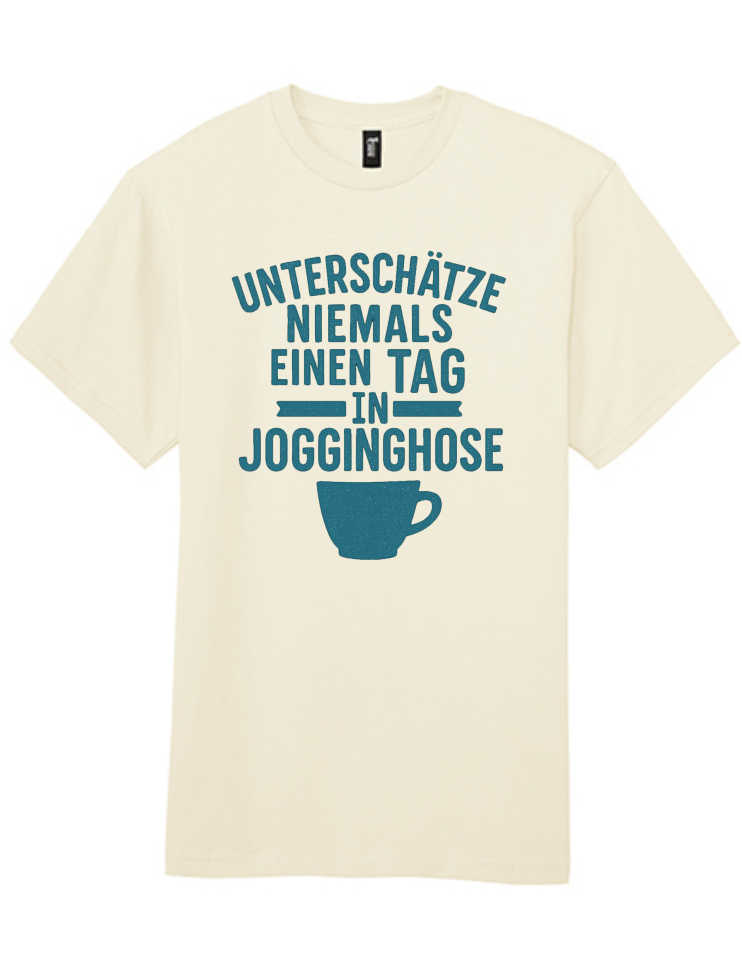 Kennen Sie das Gefühl? Manchmal sind die besten Tage die, an denen man sich einfach fallen lassen und den Komfort genießen kann. Genau dafür ist unser "Unterschätze Niemals Einen Tag In Jogginghose" T-Shirt gemacht! Dieses charmante T-Shirt in einem beruhigenden Cremeton trägt die humorvolle Botschaft in einem klaren, blauen Druck, ergänzt durch eine gemütliche Kaffeetasse – das perfekte Symbol für einen entspannten Tag. Es ist eine liebevolle Hommage an alle, die wissen, dass wahre Produktivität manchmal in den bequemsten Outfits beginnt, oder einfach an die Schönheit eines ruhigen Tages.