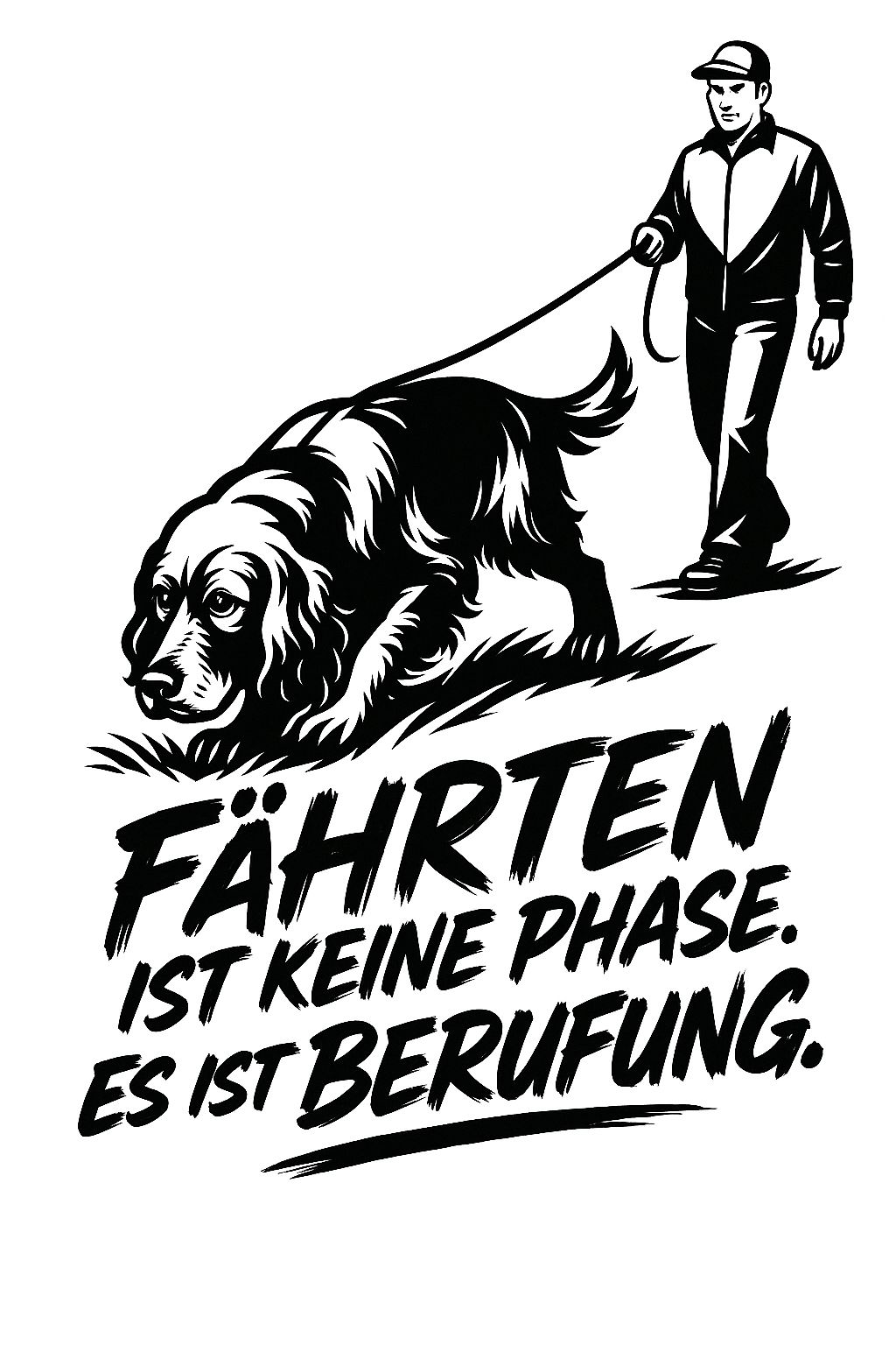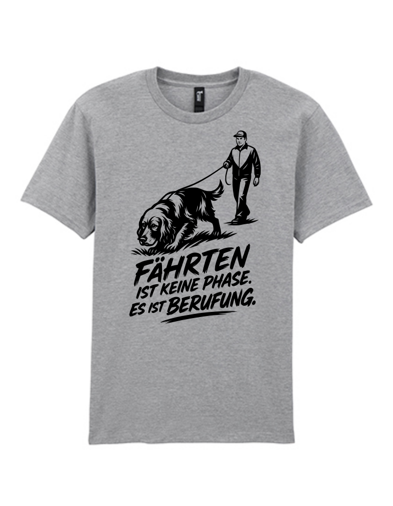 Zeigen Sie Ihre Leidenschaft für Fährtenarbeit und Ihre Liebe zu Cocker Spaniels mit diesem einzigartigen T-Shirt! Das Design zeigt einen Hundeführer mit seinem Spaniel bei der Fährtenarbeit und den Spruch "Fährten ist keine Phase. Es ist Berufung."