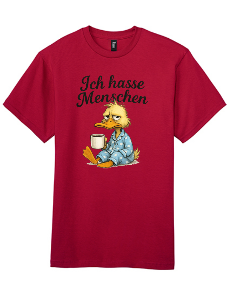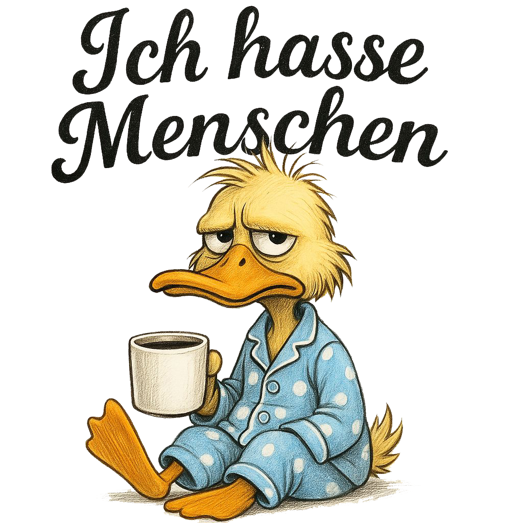 Kennen Sie das Gefühl, wenn der Wecker klingelt und Sie am liebsten einfach nur Ihre Ruhe hätten? Unser "Ich hasse Menschen" T-Shirt ist das ultimative Statement für alle Morgenmuffel, Introvertierten und Zyniker mit Herz! Dieses tiefrote Shirt zeigt eine unwiderstehlich grantige Ente im Schlafanzug, die mit ihrer Kaffeetasse den Tag beginnt und dabei eindeutig "keine Lust auf Menschen" hat. Ein humorvolles Design, das jeder verstehen wird, der montags seine fünf Minuten hat (oder sieben Tage die Woche).