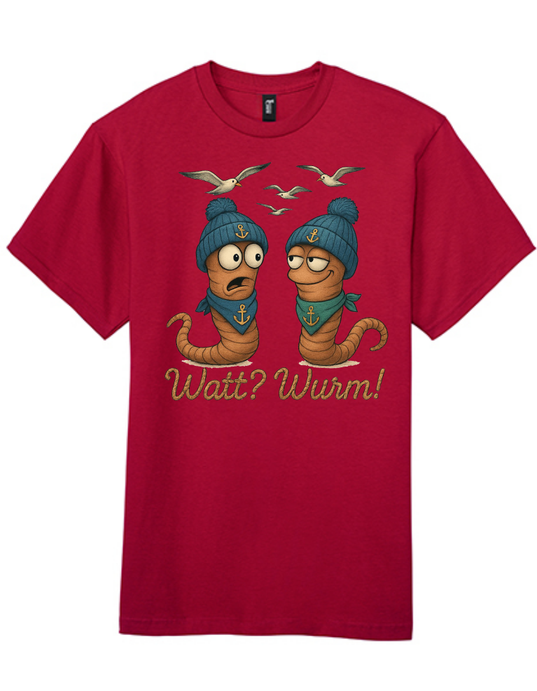 "Watt? Wurm!" – Wenn der humorvolle Spruch an der Nordseeküste die einzige Antwort auf Fragen ist. Dieses T-Shirt feiert den besten Wortwitz des Wattenmeers mit zwei charmanten Wattwürmern in bester Seemannsmanier. Ein klares Statement für alle, die das Meer lieben, den trockenen Humor schätzen und wissen, dass man im Watt am besten einfach schweigt und gräbt. Ein Must-have für Küstenkinder und alle, die es werden wollen.